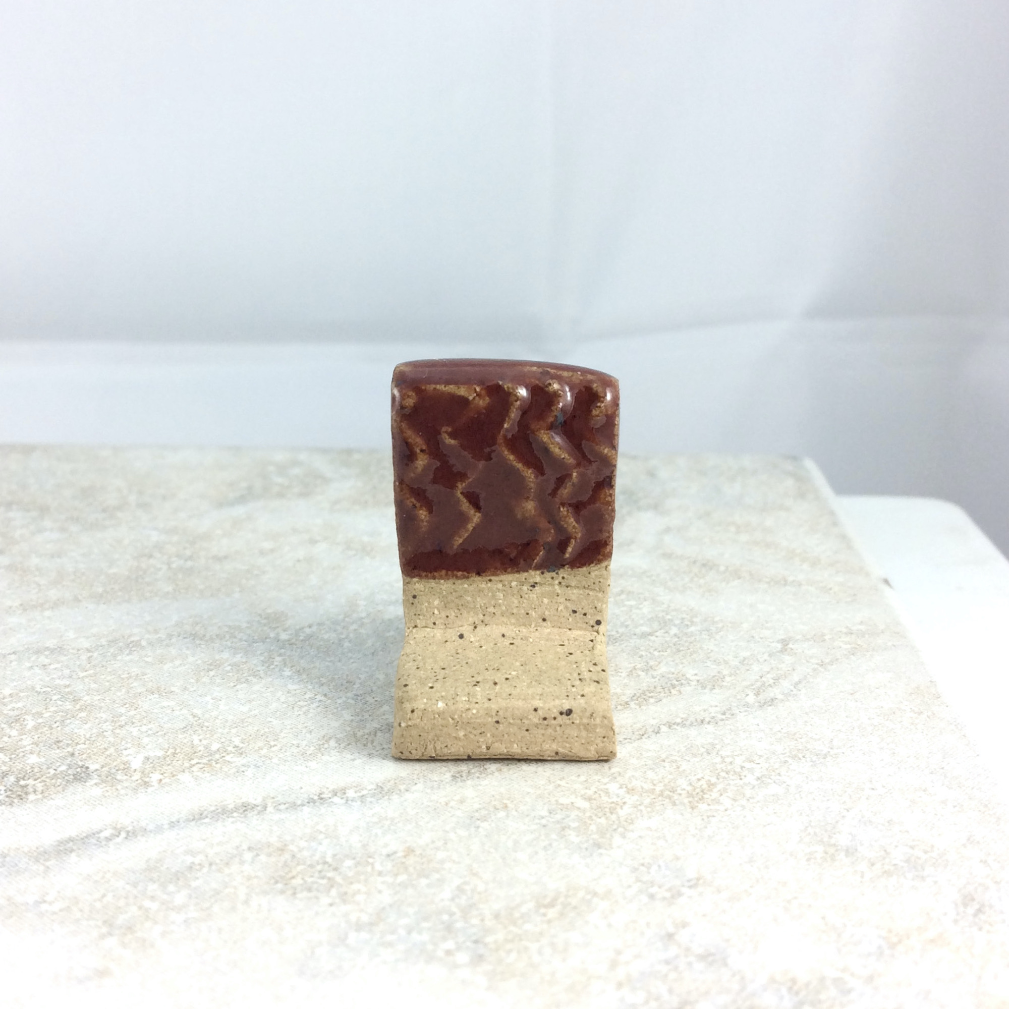 Amaco Deep Firebrick is glaze 9 in the series of commercial glaze tests. As the name says, it is a deep brick red gloss that will break over heavy texture, especially on white clays. It's a long time ceramist favorite in the Potter's Choice line. Dipped for 3 seconds, fired to cone 5 1/2 on Kentucky Mudworks and Standard (112) clays.